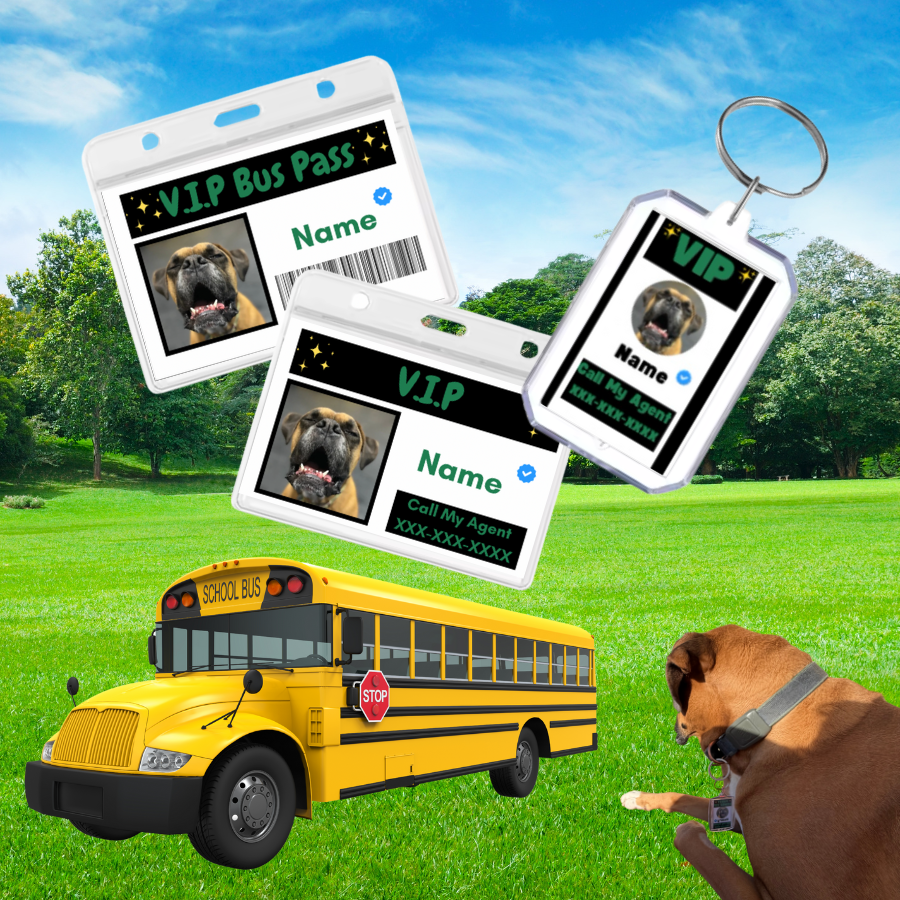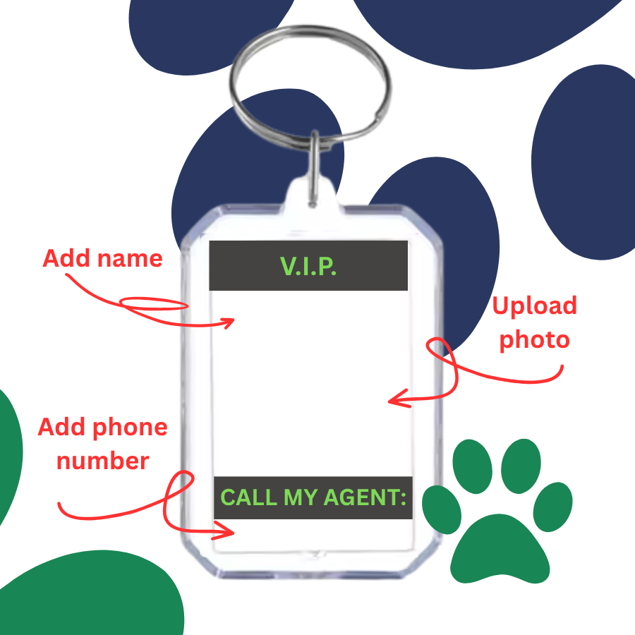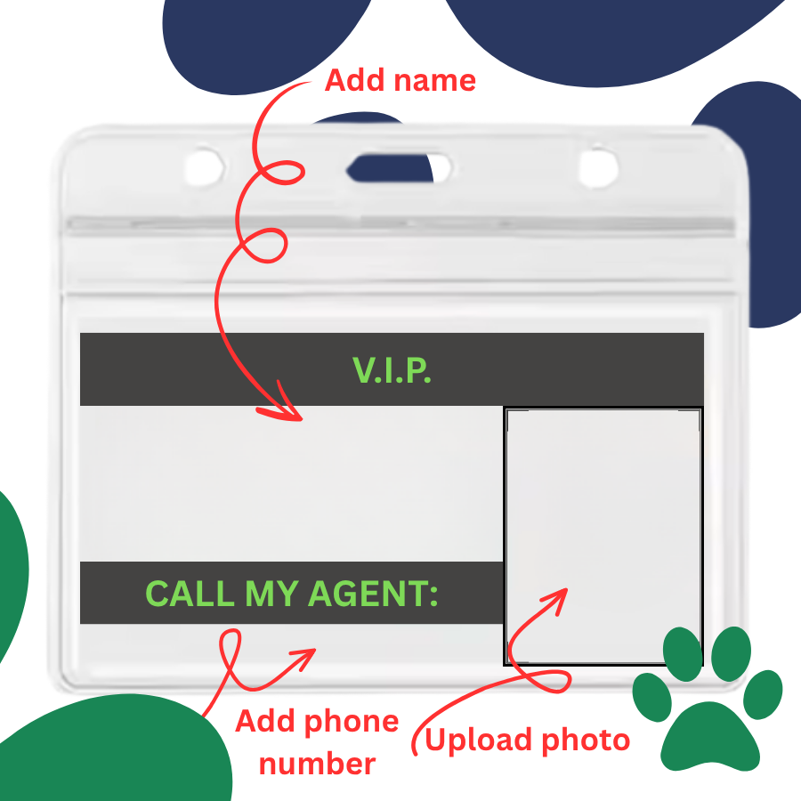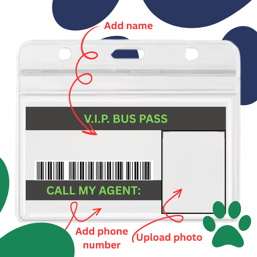 Type in your dog's name, agent's phone number, and upload your dog's photo to get a VIP buss pass collar clip printed as per your requirements.